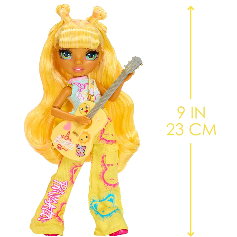 Sunny está estilizada en su icónico amarillo de la cabeza a los pies, con un hermoso cabello amarillo largo y cepillable. Su encantadora escultura de rostro juvenil, sus delicadas pestañas largas y sus cautivadores ojos de cristal se suman a su irresistible encanto.