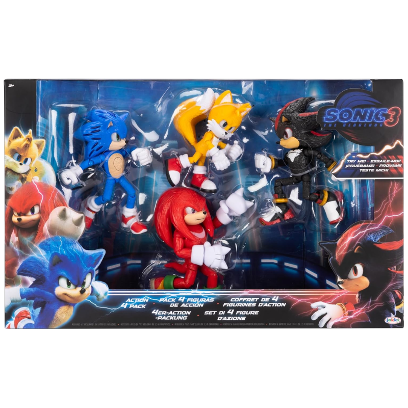 De la película Sonic The Hedgehog 3, este paquete de 4 figuras a escala de 5 pulgadas incluye Tails, Sonic, Knuckles y Shadow.